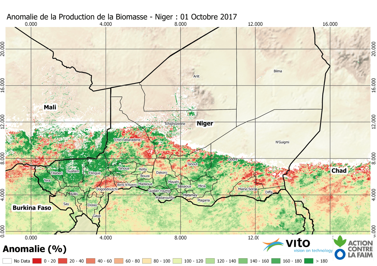 Analyse de Biomasse- Niger 2017 03/10/201725/10/2017Telecharger le Rapport (PDF) Les données en Excel et Shapefile sont disponibles sur Humanitarian Data Exchange Indice de Vulnerabilité Niger 2017 Production Niger 2017 Anomalie Niger 2017 Production 2017 / Production 2011 en (%) Production 2017 / Production 2016 en (%)