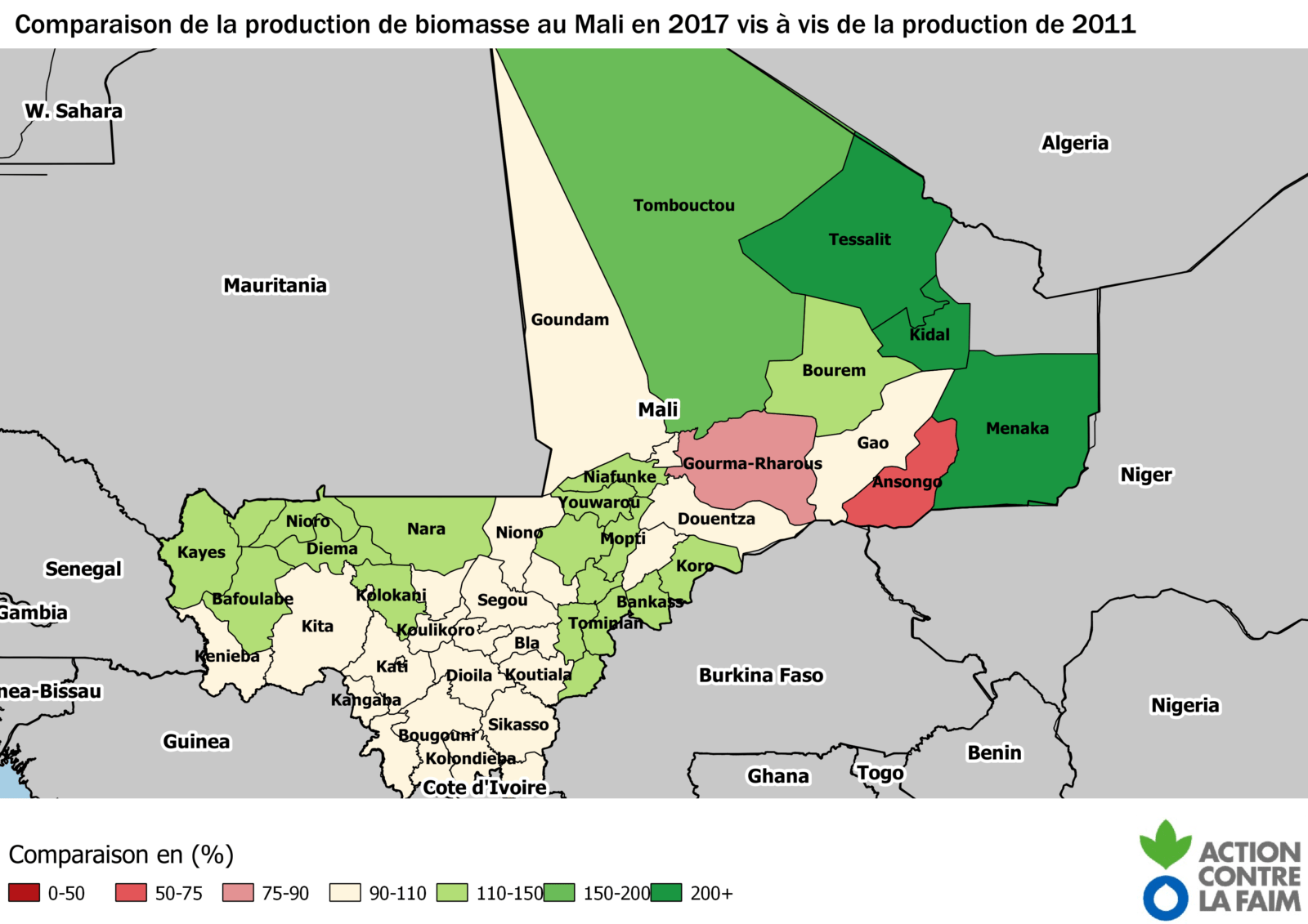 Biomasse Analyse de Biomasse – Mali 2017 03/10/201723/10/2017Telecharger le rapport iciLes données en Excel et Shapefile utilisées pour ces cartes sont disponibles sur Humanitarian Data Exchange Indice de Vulnerabilité Mali 2017 Production Mali 2017 Anomalie Mali 2017 Production 2017 / Production 2016 en (%) Production 2017 / Production 2011 en (%)