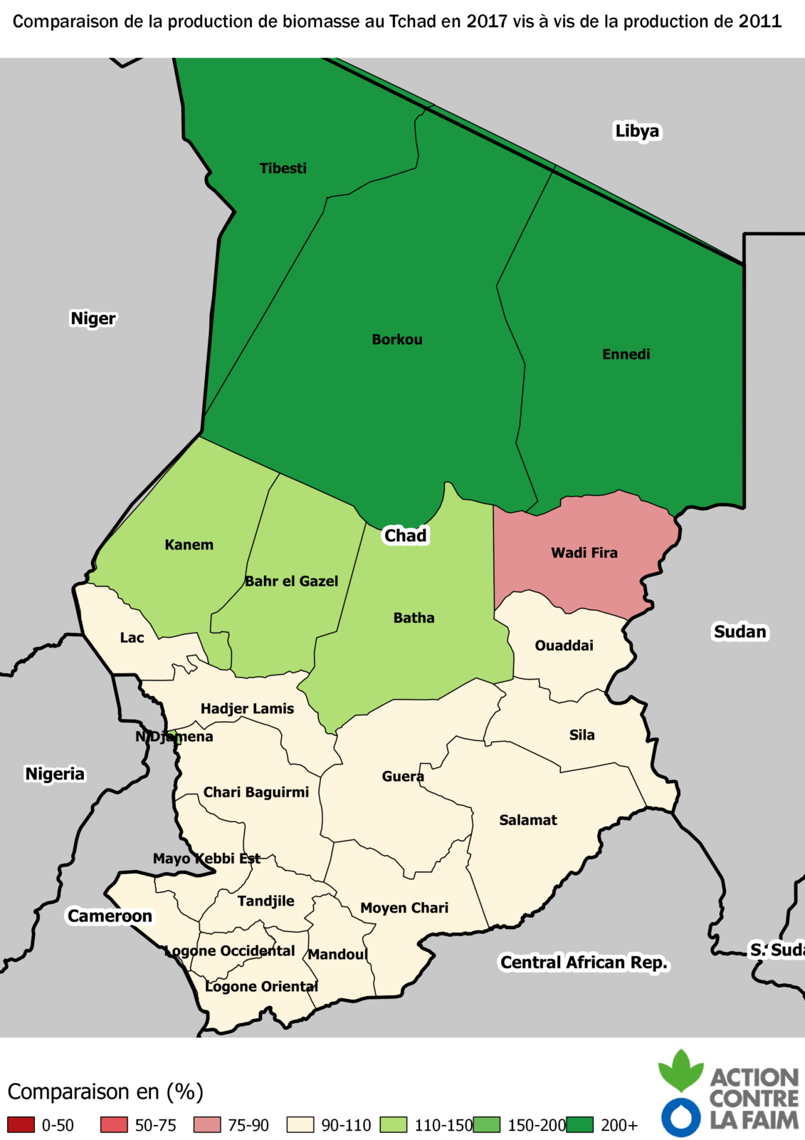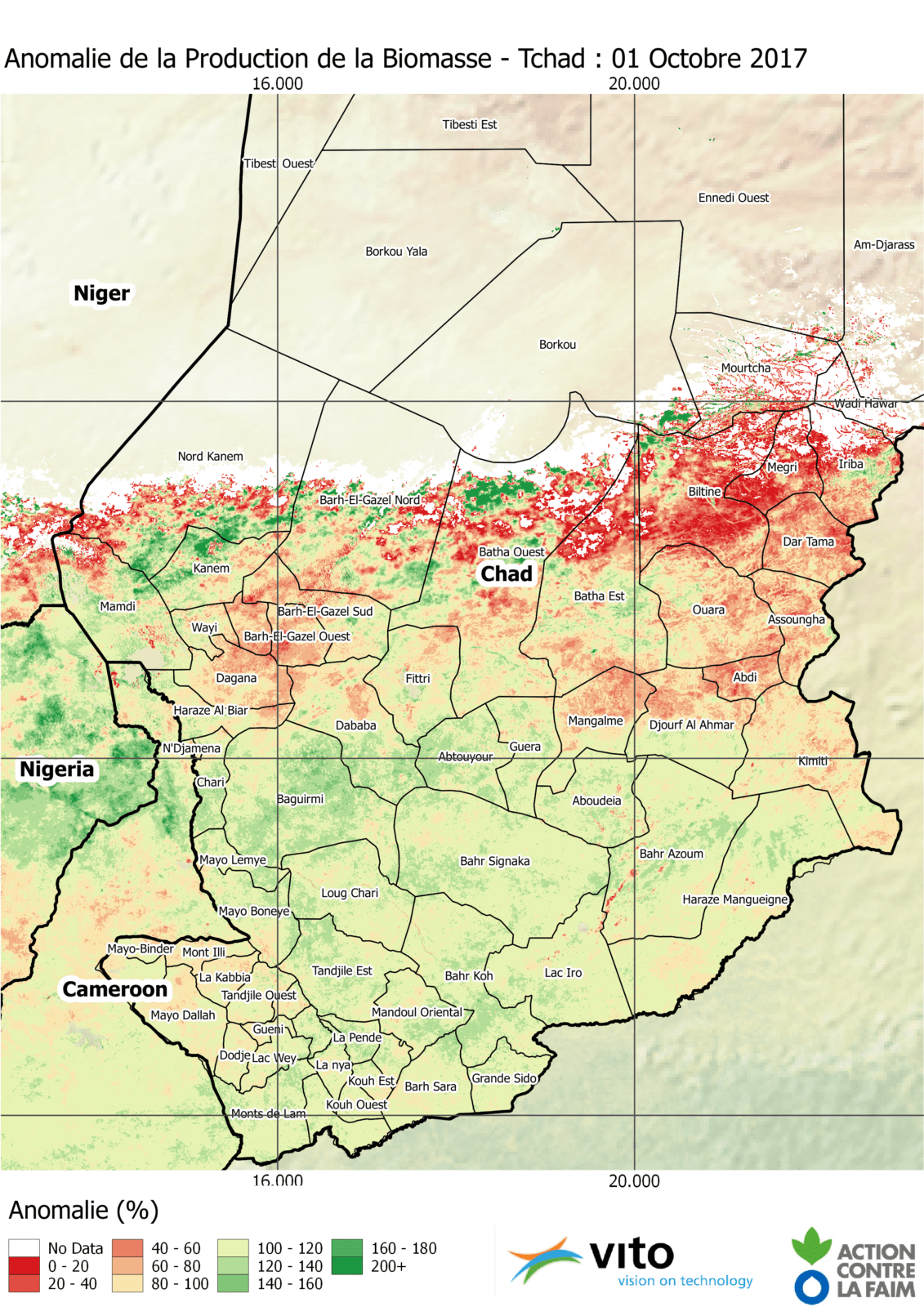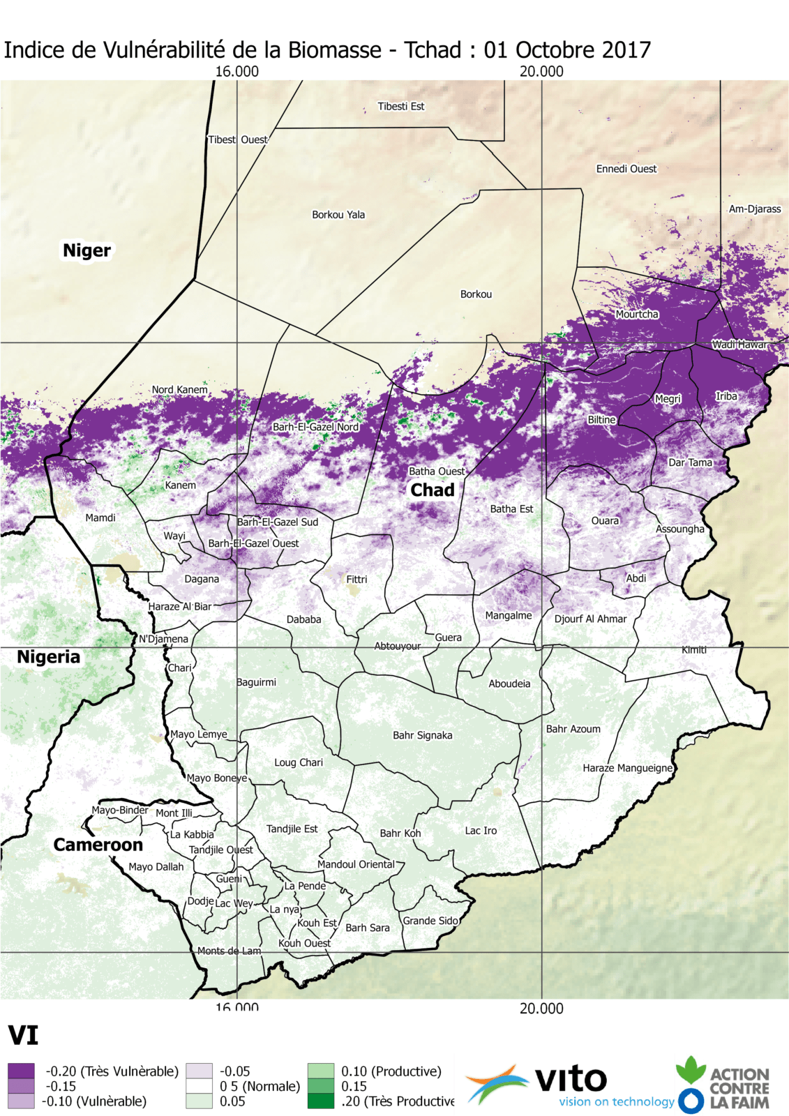 Biomasse Analyse de Biomasse – Tchad 2017 03/10/201725/10/2017Telecharger le rapport (PDF)Les données en Excel et Shapefile sont disponibles sur Humanitarian Data Exchange Indice de Vulnerabilité Tchad 2017 Production Tchad 2017 Anomalie Tchad 2017 Production 2017 / Production 2016 en (%) Production 2017 / Production 2011 en (%)