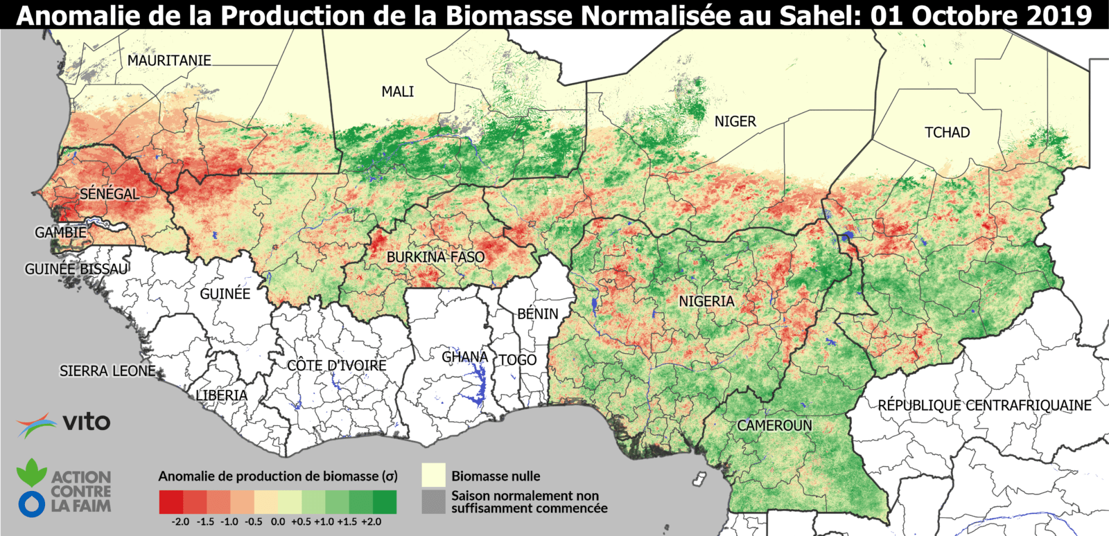 Biomasse Cartes Biomasse Sahel 2019 02/10/201902/10/2019 Au Sahel, on observe une situation très variable entre les pays. Alors que l’Est de la région a observé un démarrage normal de la saison végétative, le Sénégal et la Mauritanie à l’Ouest ont accusé deux mois de retard causant d’importants déficits de pâturage. Cette année fait suite à plusieurs années déficitaires dans ces pays augmentant le degré de vulnérabilité des communautés pastorales. Des poches déficitaires de biomasse sont également observées au Niger et au Tchad.Sénégal : Importants déficits dans le Ferlo (régions de Matam, Saint Louis et Louga) ainsi que dans les régions de Thiès, Diourbel, Fatick, Kaolack et Kaffrine. La situation de la biomasse au Sénégal est déficitaire presque partout par rapport à l’année dernière.Mauritanie : Déficits très importants dans les régions de Brakna, Trarza et Gorgol. Déficits importants dans les régions du Guidimakha et de l’Assaba avec une situation plutôt favorable bien que très variable spatialement dans les Hodhs.Mali : Production de la biomasse globalement favorable, particulièrement dans les régions de Gao, Menaka et Tombouctou. Dans le reste du pays la situation est proche de la normale des 21 dernières années à l’exception de l’Ouest de la région de Kayes où des déficits importants sont observés.Niger : Production de la biomasse globalement moyenne, sauf dans les régions de Zinder et Diffa où on observe des poches déficitaires inquiétantes surtout dans la partie traditionnellement pastorale. Certaines zones de déficit sont également observées au Nord de la région de Tahoua ainsi qu’à la frontière entre les régions de Tillabéri, Tahoua et Dosso.Burkina Faso : Situation globalement normale, avec des déficits modérés dans la région de l’Est et de la boucle du Mouhoun (départements de Oudalan et du Soum).Tchad : Production légèrement excédentaire avec quelques poches déficitaires au Nord du pays (région de Kanem, Ennedi Ouest et Wadi Fira). Recommandations : Informer les organisations pastorales dans les zones déficitaires et corroborer les informations sur la situation de la biomasse afin de préparer au mieux la transhumance.Revoir les plans de réponse et plans de contingence pour faciliter l’adaptation à la soudure pastorale potentiellement précoce dans les zones de déficit.Point d’attention sur la pluviométrie : souvent, le cumul de la pluviométrie est utilisé comme proxy pour l’analyse de la biomasse. Or, le cumul pluviométrique peut souvent cacher des nuances importantes, particulièrement si nous avons une forte pluviométrie sur une période très courte suivi par de longues périodes sèches. Cette situation n’est pas favorable à la croissance de la végétation, même si on atteint une pluviométrie cumulative excédentaire. De plus, cela peut causer des inondations destructrices comme ce fut le cas fin août au Guidimakha (Mauritanie) augmentant la vulnérabilité des communautés.D’ici la fin du mois d’octobre, le bulletin régional ainsi que l’analyse de la biomasse par pays seront disponibles sur ce site.Pour plus d’informations sur comment lire les différentes cartes, veuillez cliquer ici.